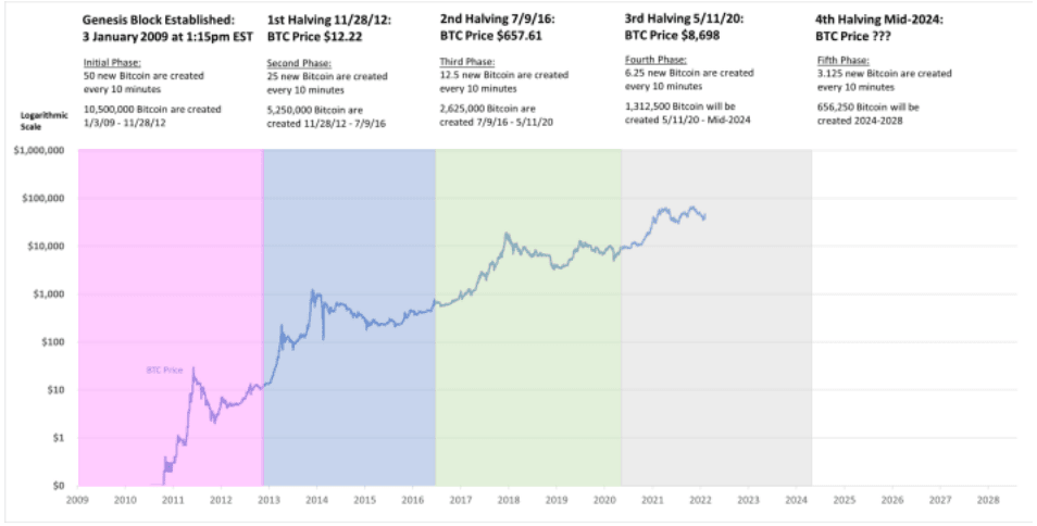 This chart shows the separate phases of Bitcoin block rewards and the associated halving dynamics. Each colored zone is a different “era”