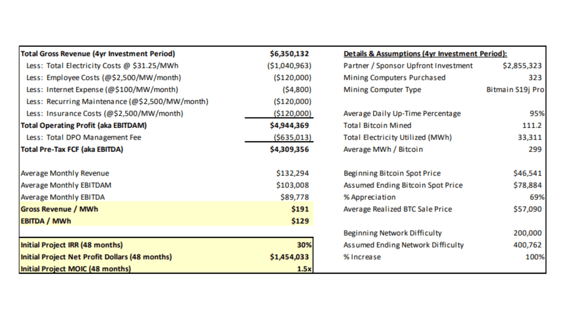 A Hypothetical 1MW site is outlined in the image below for illustrative purposes only and several structural elements are open for negotiation and customization.  A one-megawatt site under our base case assumptions over a 4-year investment period, would produce a 30% IRR, $1.5mm of net profits, and a 1.5x MOIC. Such a site would produce over 111 Bitcoin and consume over 33,300 MWh of power during that same 4-year period, assuming ~95% up-time. Future 4-year follow-on investment periods at the same site would produce even greater IRRs and net profit.