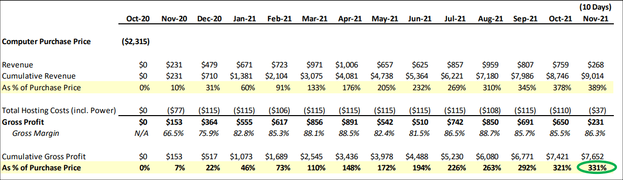 DPO’s second batch of computers at this same site in January 2021 earned back 33% of their $6,100 purchase price in only 3 months of operations before redeploying those units elsewhere as part of a new customer pilot operation.