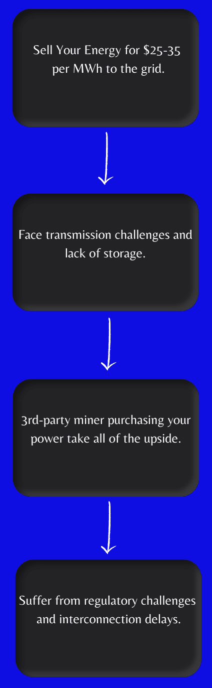 We execute this strategy at your site and on your behalf, while you remain in control of your power generating asset and capture all of the upside. Our team will remotely monitor our on-site employees in order to maximize revenue generation, minimize downtime, and allow for incredible flexibility in how we operate. Unlike traditional data centers we can toggle operations on or off to get you the highest value and the best possible outcome.